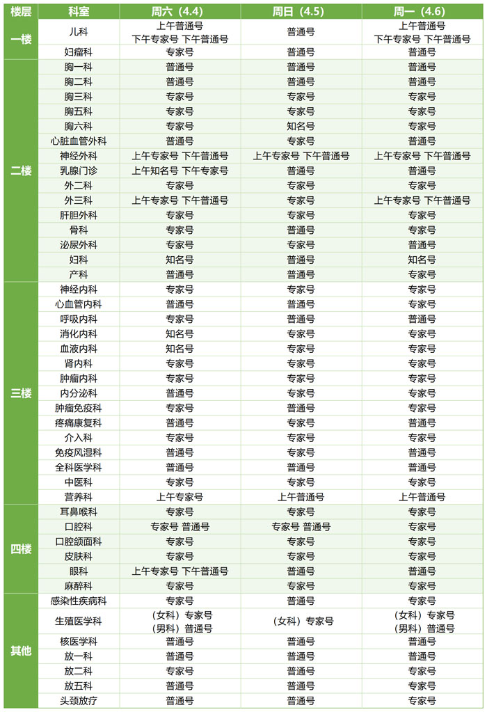 为保障清明假期诊疗需求,4月4日-6日,我院门诊、急诊照常运行,医疗服务“不停歇”,为您的健康保驾护航。各科室具体出诊时间、专家排班及注意事项均已详细列出,方便您随时查阅,以便高效、顺畅就诊。